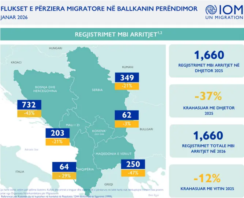 Flukset migratore përgjatë rrugës së Ballkanit Perëndimor kanë shënuar një rënie në fillim të vitit 2026. Sipas të dhënave të Organizatës Ndërkombëtare për Migracionin (IOM), në janar të këtij viti u regjistruan gjithsej 1,660 hyrje të parregullta në rajon. Ky nivel është rreth 37% më i ulët krahasuar me muajin dhjetor 2025 dhe rreth 12% më pak se në të njëjtën periudhë të një viti më parë.
