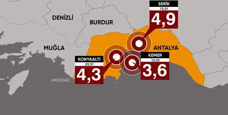 Një tërmet i fuqishëm goditi këtë të hënë Gjirin e Antalias, me magnitudë 4.9 ballë, sipas raportimeve të autoriteteve. Të dhënat më të fundit nga AFAD tregojnë se tërmeti ndodhi në orën 13:21, me thellësi 28.25 kilometra.
